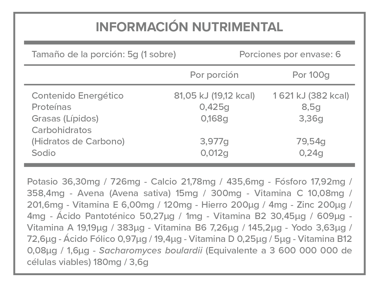 Maltodextrina, Leche de Soya [Aislado de Proteína de Soya, Aceite de Palma, Sólidos Lácteos, Suero de Leche, Sacarosa, Fosfato de Calcio, Monoglicéridos, Lecitina, Saborizante Artificial, Vitamina A, Vitamina C, Óxido de Zinc, Vitamina D, Hierro, Vitamina B12, Riboflavina, Yoduro de Potasio, Betacaroteno (como colorante) y Metabisulfito de Sodio], Fructooligosacáridos, Sacharomyces boulardii, Dióxido de Silicio, Sabor Leche, Fosfato dibásico de Calcio, Avena (Avena sativa), Cloruro de Potasio, Ácido Ascórbico (Vitamina C), Acetato de Alfa Tocoferol (Vitamina E), Hierro, Pantotenato de Calcio (Vitamina B5), Riboflavina 5 Fosfato de Sodio (Vitamina B2), Clorhidrato de Piridoxina (Vitamina B6), Ácido Fólico, Yoduro de Potasio y Cianobalamina (Vitamina B12).